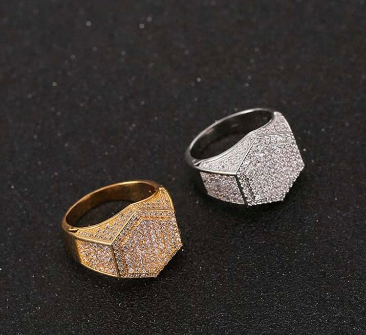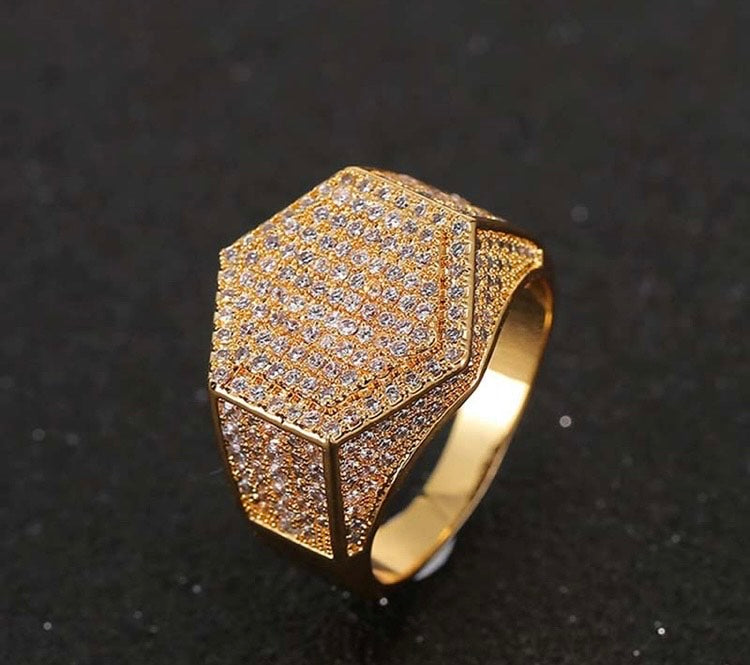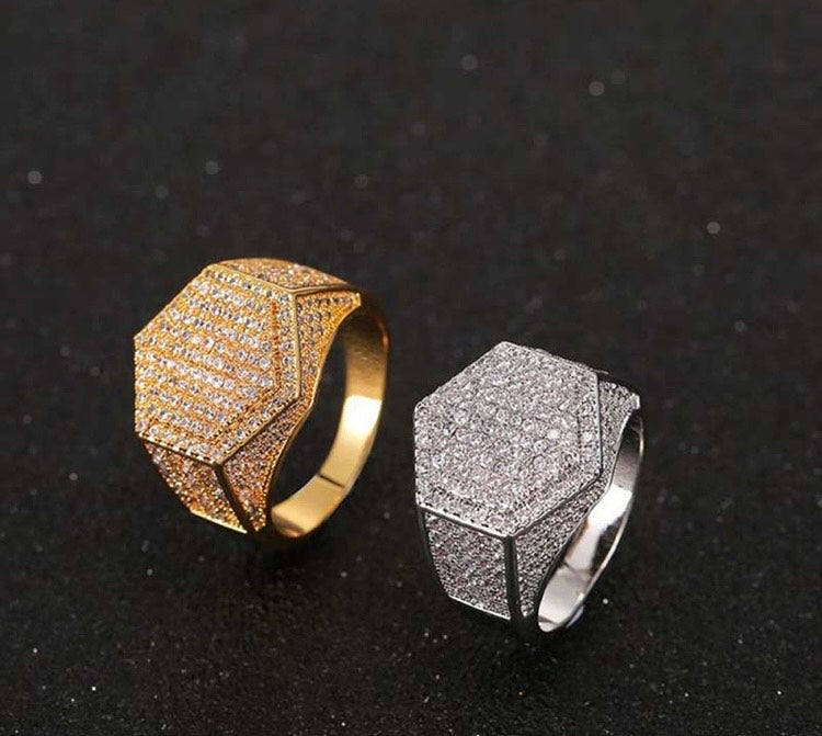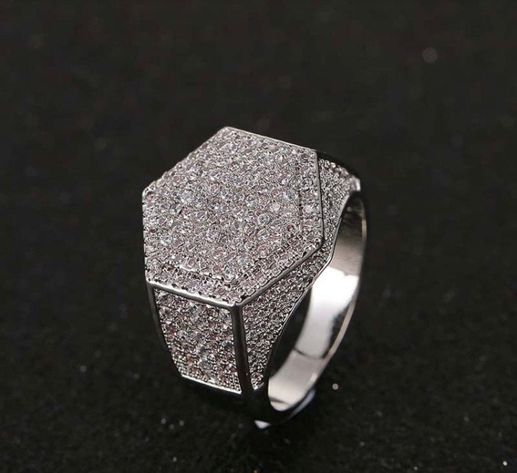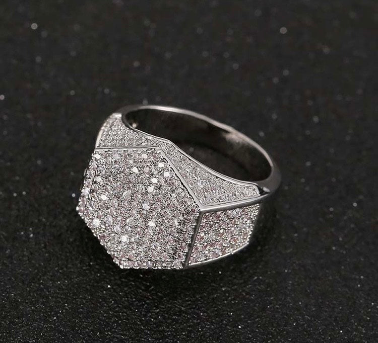 Elevate your accessory game with the Hexagon Frost Ring — a bold, modern statement piece designed for those who lead with presence. Featuring a geometric hexagonal face and precision-set cubic zirconia stones across the top and sides, this ring delivers an unmistakable shimmer from every angle.