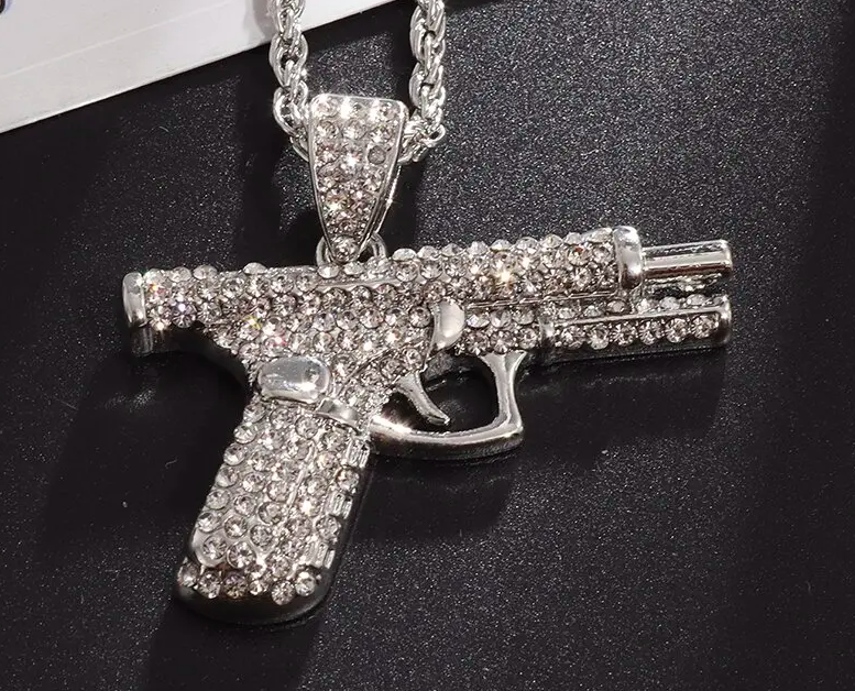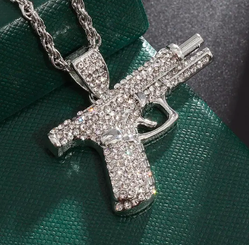 This Iced-out pistol pendant brings heat to your fit without breaking your wallet. Made for bold self-expression, this pice stands alone or pairs perfectly with your favorite chain.