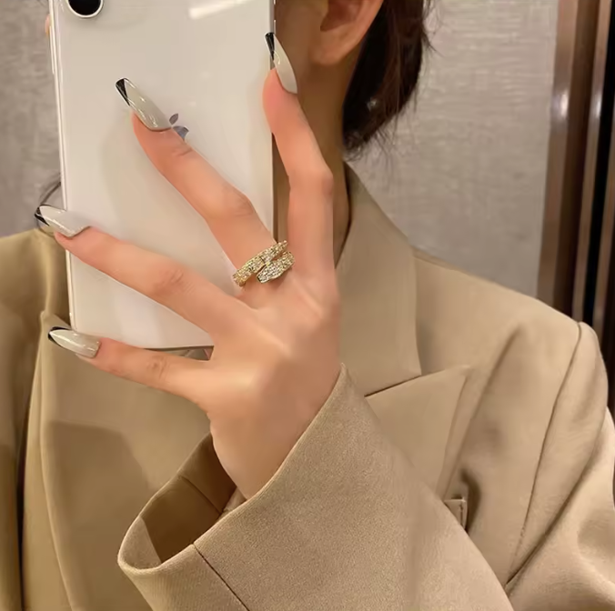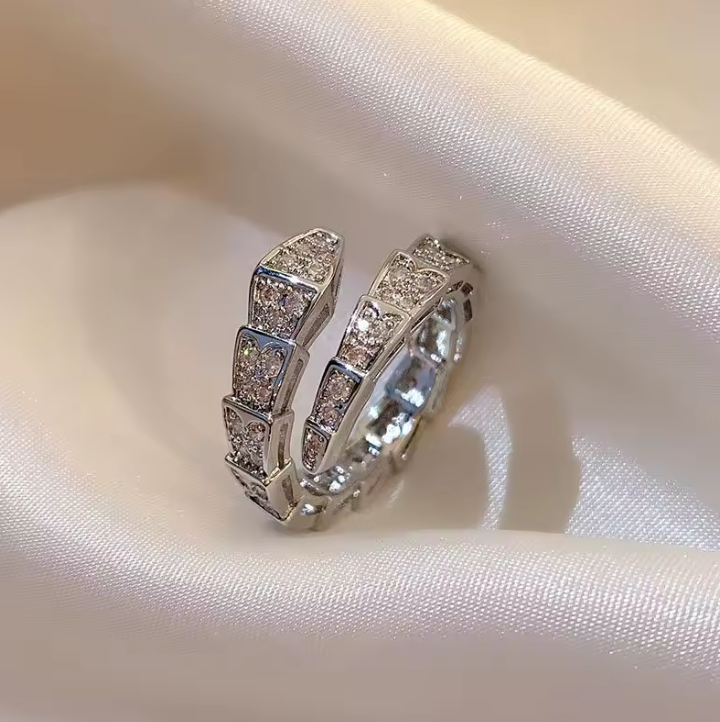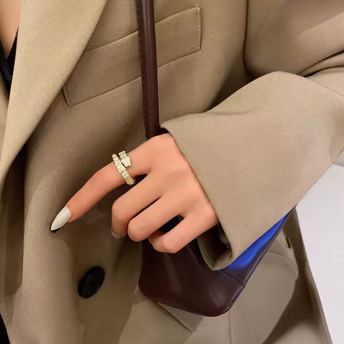The Viper Band is more than a ring — it’s a flex in motion. Designed with a unique segmented “snakebone” silhouette, this open-face gold crystal armor ring wraps your finger in shine and dominance. Each polished segment is set with shimmering crystals for a fierce look that demands attention.